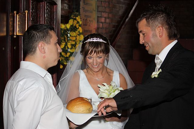 At a wedding, this custom can take one of two forms. On the one hand, the hosts of the event (usually the parents of the bride and/or groom) can welcome the newly wed couple with bread and salt upon their entrance to the reception.